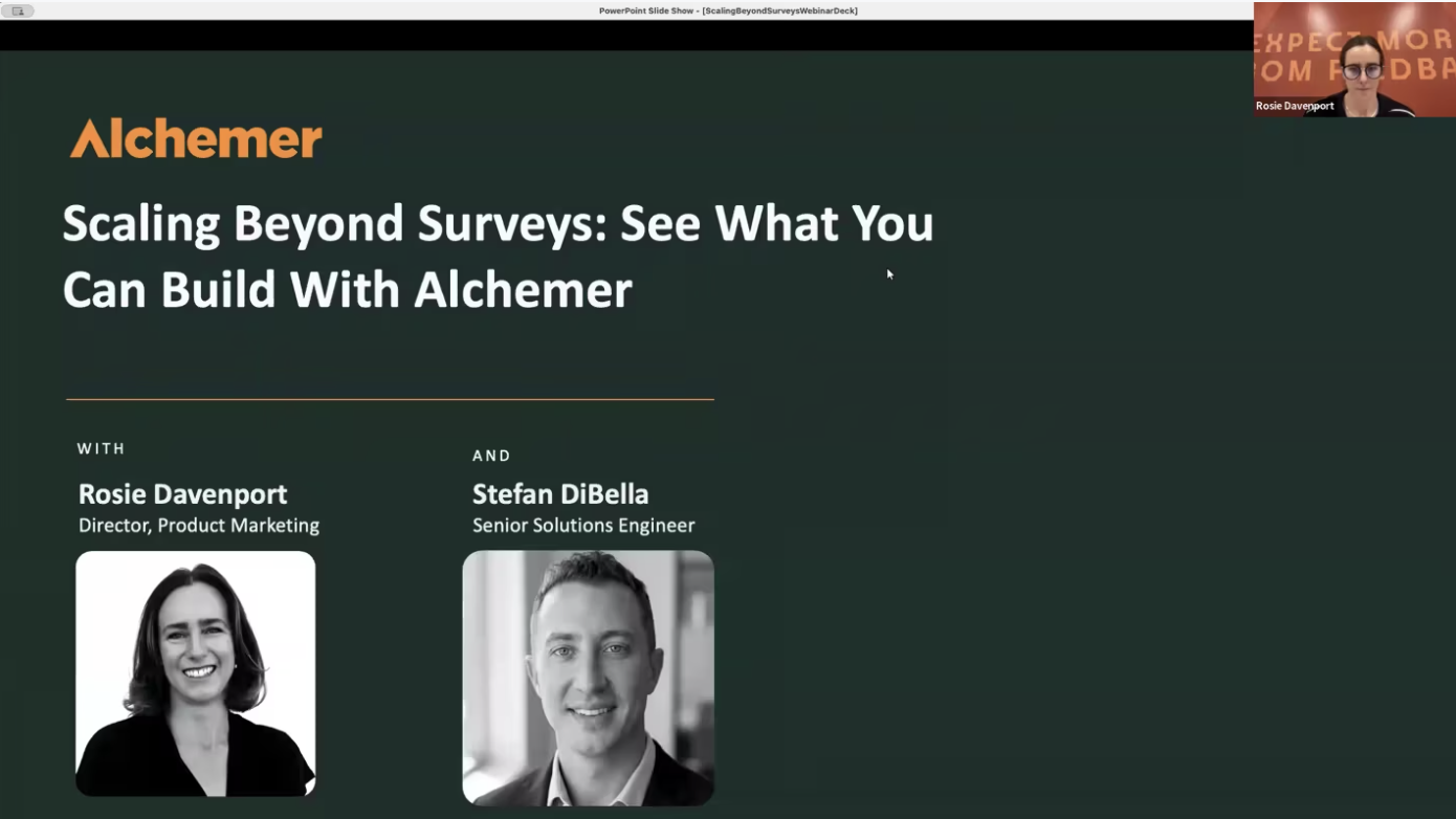 In this fast-paced webinar, we’ll help you scale beyond one-off surveys with a fast, practical tour of the Alchemer platform. You’ll get a live demo of what you can build, including web and in-product feedback collection, automated workflows that help you close the loop, and reporting built for ongoing programs.