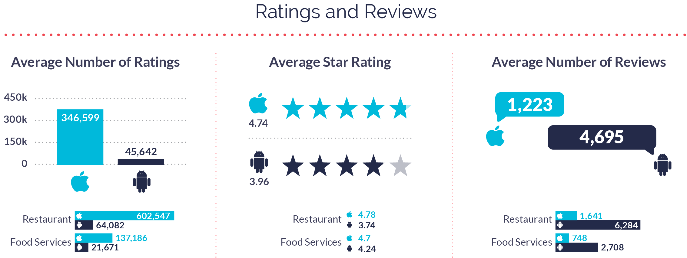 Food and Drink app ratings and and reviews were slightly higher than macro averages across both iOS and Android, particularly within the Restaurants category. The average iOS app saw 346,599 app store ratings, received a 4.74 star rating, and had 1,223 app store reviews. Android apps saw 45,642 app store ratings, received an average 3.96 star rating, and had 4,695 app store reviews.