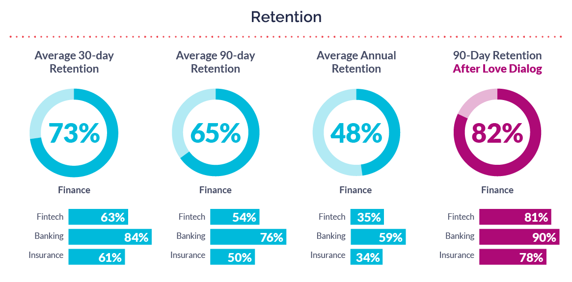 Finance apps typically have high retention rates, which held true in 2021. Collectively, the category had 30-day retention of 73% (67% overall), 90-day retention of 65% (58% overall), and annual retention of 48% (44% overall). It’s likely that Finance apps see lower churn than other categories due to the simple fact that it’s harder for people to change banks and shift their financial planning tools than it is to, say, try a new restaurant. But retention is the best indicator of consumer happiness, which is driven by teams who collect and act on their feedback. When engaged with a Love Dialog, 90-day retention grew to 81% in Fintech, 78% in Insurance, and 90% in Banking—said another way, almost all Banking consumers were retained for three months after they engaged with a Love Dialog.