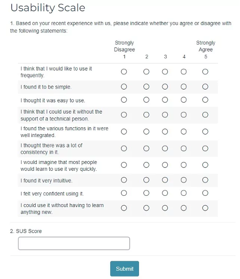 Although it’s ten questions long, the SUS survey uses simple scale questions that are quick and easy for respondents to follow: